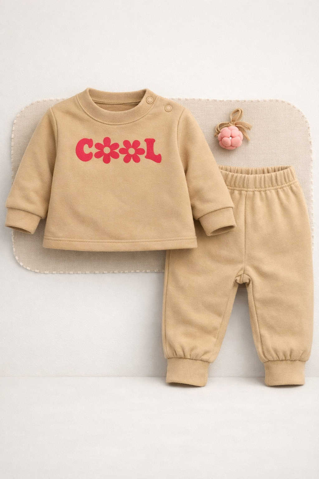 Bebeğinizin hassas cildi için tasarlanan krem renkli ikili bebek takımı, hem konforlu hem şık bir görünüm sunar. Yumuşak dokulu üst ve esnek bel yapısına sahip alt ile gün boyu rahat kullanım sağlar. Minimal tasarımı ve sevimli “Cool” baskı detayıyla günlük kullanım için idealdir.