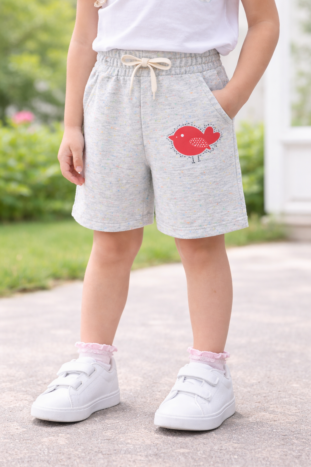 Kız çocuklar için özel tasarlanan bu gri kuş baskılı şort, hem rahatlığı hem de şirin görünümü bir arada sunar. Yumuşak ve nefes alabilen kumaşı sayesinde yaz aylarında terletmez, gün boyu konfor sağlar.