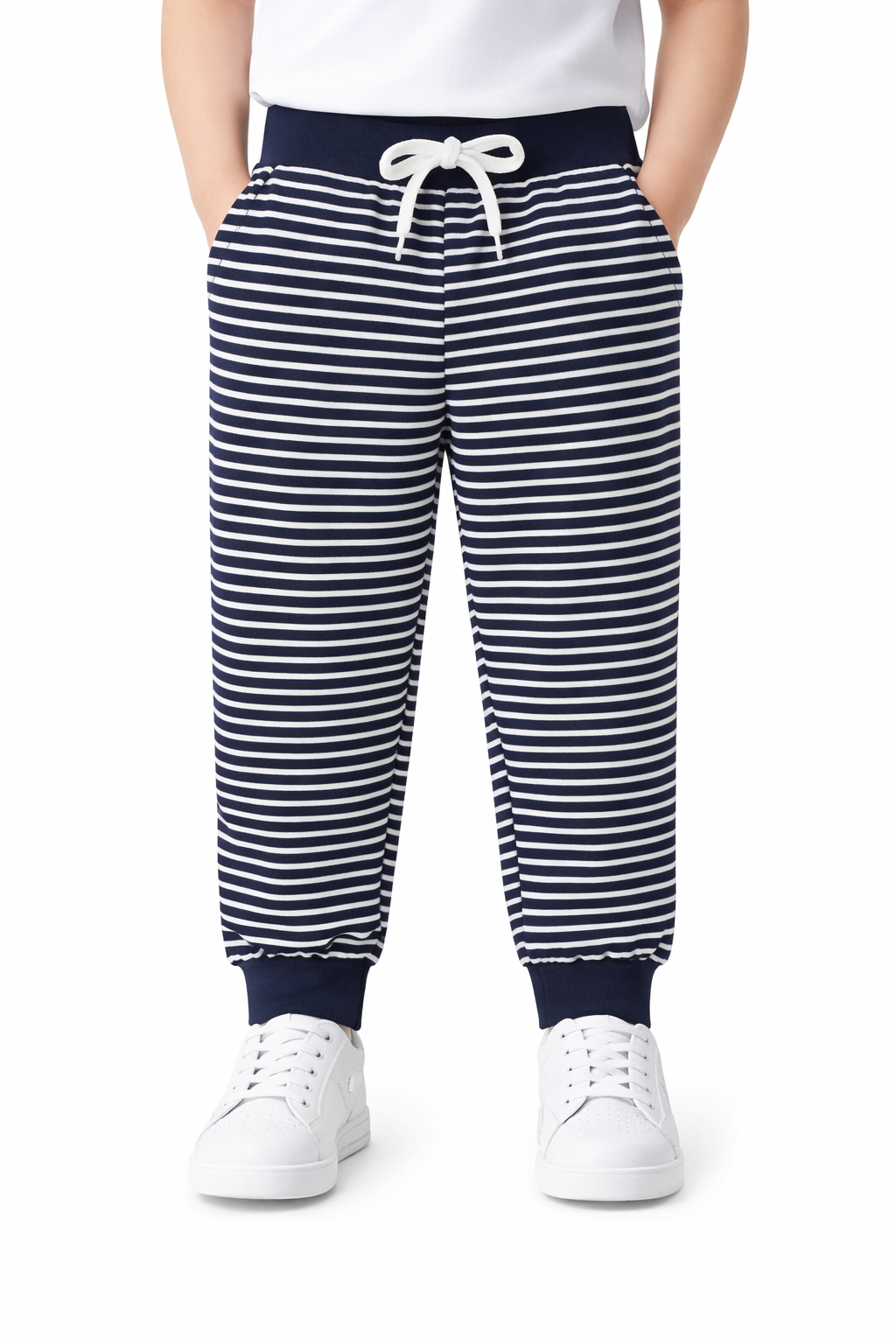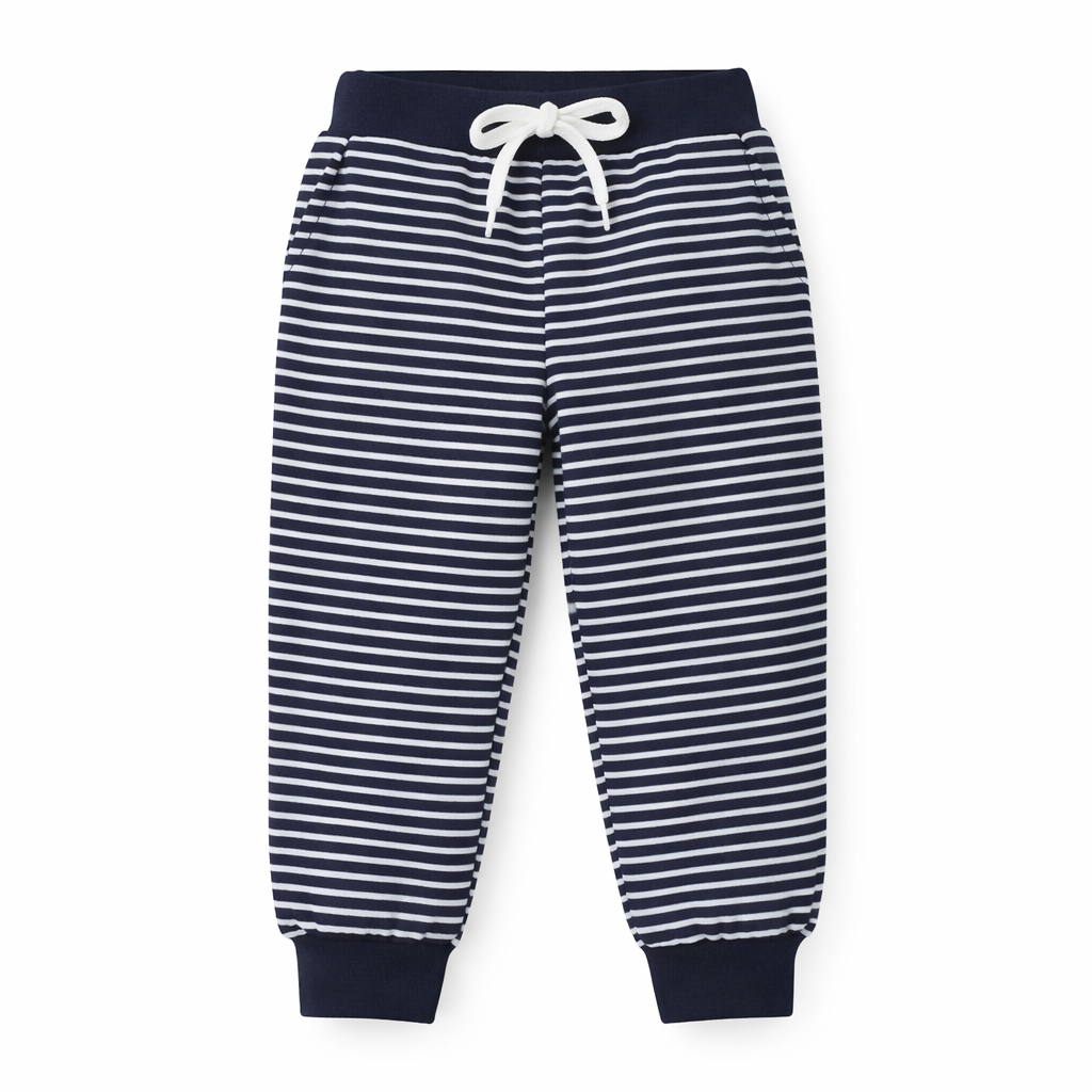 Lacivert çizgili kız çocuk eşofman altı, lastikli paça (jogger model) yapısı ve rahat kalıbı ile günlük kullanım için idealdir. Yumuşak kumaşı sayesinde gün boyu konfor sağlar.